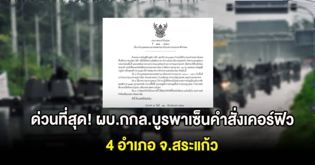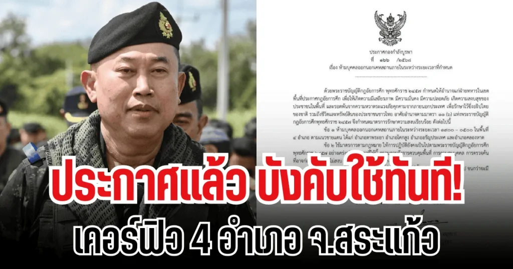 บังคับใช้ทันที! กองกำลังบูรพา ประกาศเคอร์ฟิว 4 อำเภอ จ.สระแก้ว เปิดห้วงเวลาที่กำหนด