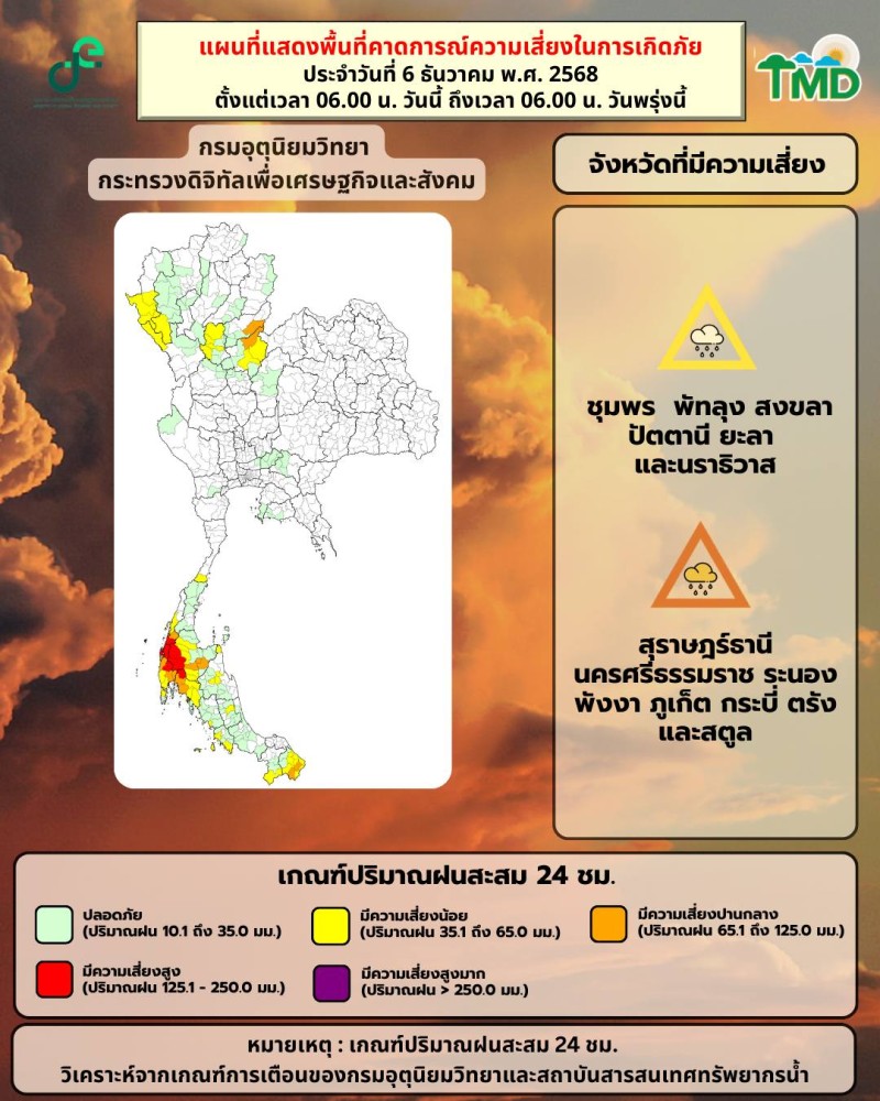 วันที่ 6 ธันวาคม 2568 กรมอุตุนิยมวิทยา  พยากรณ์อากาศ 24 ชั่วโมงข้างหน้า ภาคใต้มีฝนเพิ่มขึ้นและมีฝนตกหนักบางแห่ง โดยเฉพาะบริเวณจังหวัดชุมพร สุราษฎร์ธานี นครศรีธรรมราช พัทลุง สงขลา ระนอง พังงา และภูเก็ต ส่วนประเทศไทยตอนบน มีฝน/ฝนฟ้าคะนองเกิดขึ้นได้บางพื้นที่บริเวณภาคเหนือตอนล่าง ภาคตะวันออกเฉียงเหนือตอนล่าง และภาคตะวันออก แต่ยังคงมีอากาศเย็นในตอนเช้า ขอให้ประชาชนบริเวณภาคใต้ระวังอันตรายจากฝนตกหนักและฝนที่ตกสะสม ส่วนประชาชนในบริเวณประเทศไทยตอนบนดูแลรักษาสุขภาพจากสภาพอากาศที่เปลี่ยนแปลง และเพิ่มความระมัดระวังในการสัญจรผ่านบริเวณที่มีหมอก รวมถึงให้ระวังอันตรายจากอัคคีภัยที่อาจเกิดขึ้นได้จากสภาพอากาศแห้งไว้ด้วย