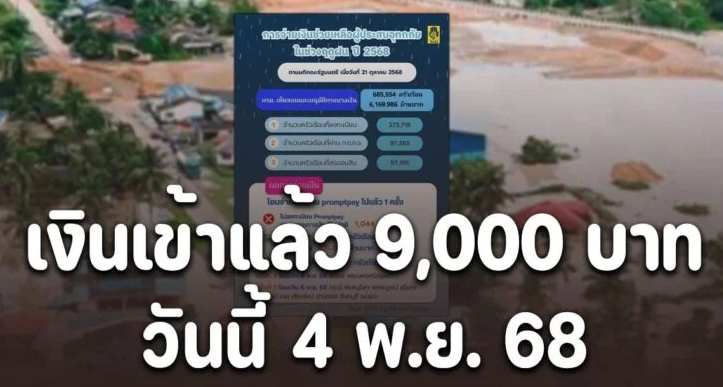วันนี้ 4 พ.ย. 68 เงินเยียวยาน้ำท่วม 9,000 บาท เข้าแล้ว!!